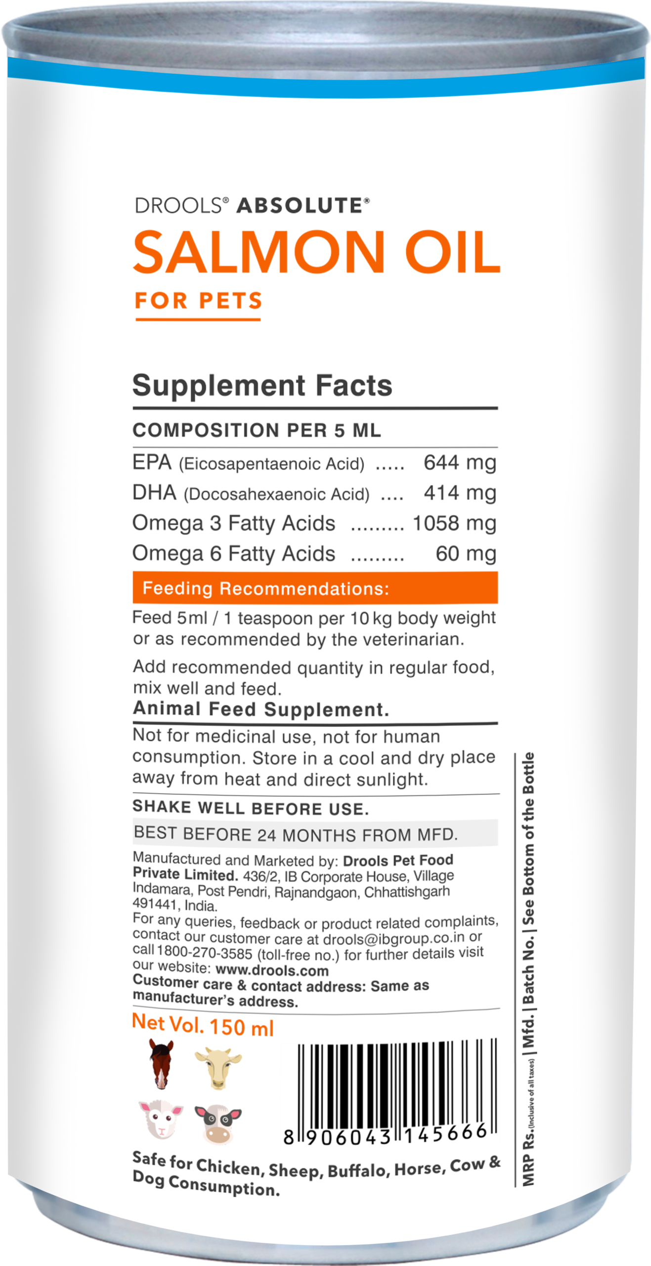 Drools Absolute Salmon Oil provides a daily supplement rich in EPA and DHA – the best Omega-3 fatty acids, that supports healthy skin and coat. Most dog’s metabolism use these nutrients immediately without any conversion. Hence it supports immune system, joint health, also keeps your dog healthy.