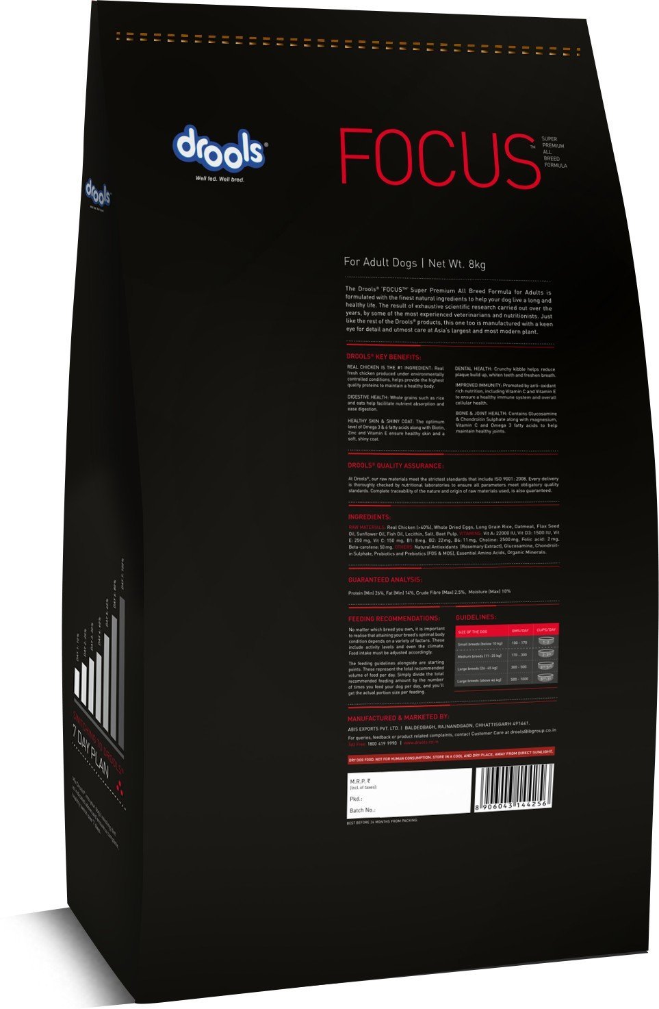 Drools Focus Super Premium Adult Dry Dog Food is an all Breed formula. A wholesome nutritional meal that ensures all the benefits from strong immunity to dental health. We provide a power packed food that your pet will love. Fortified with Vitamins, essential Amino Acids, Minerals, Antioxidants and other important ingredients Drools Focus Adult Dry Dog Food provides a complete and balanced food to your pet. After an intensive research by the experienced nutritionists and veterinarians, our ingredients undergoes a thorough test where it meets all the obligatory quality standards.