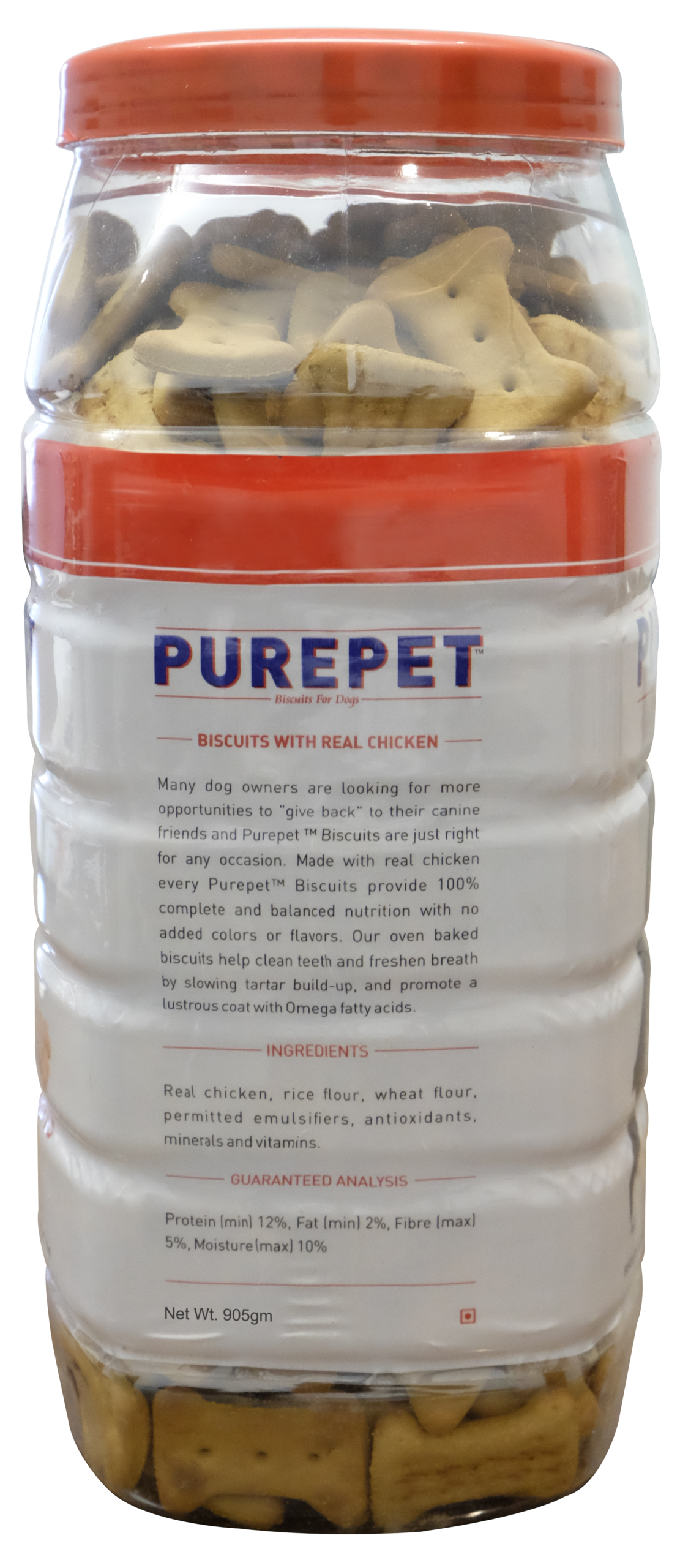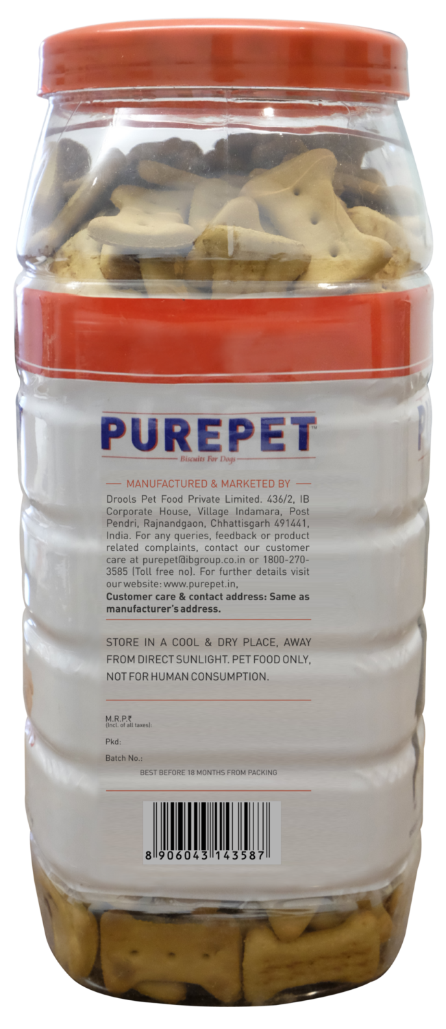 Purepet Dog Biscuits are nutritious dog treats which gives immense joy to your pet. They are made with Real Chicken, our #1 ingredient, with no added artificial colors or flavors. It helps to maintain clean teeth and also freshen breath by controlling the tartar build up, and promotes lustrous and healthy coat.